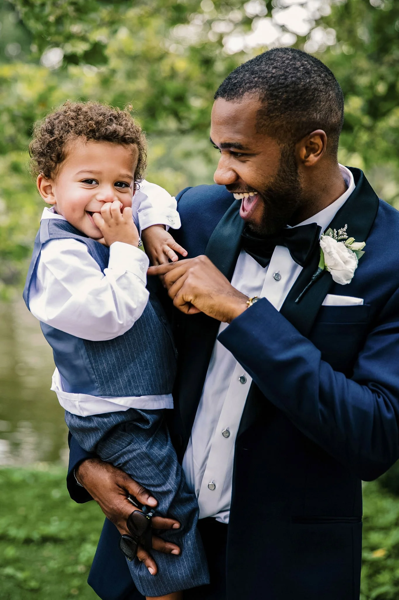 Man in blue tux is holding the ring bearer and laughing.