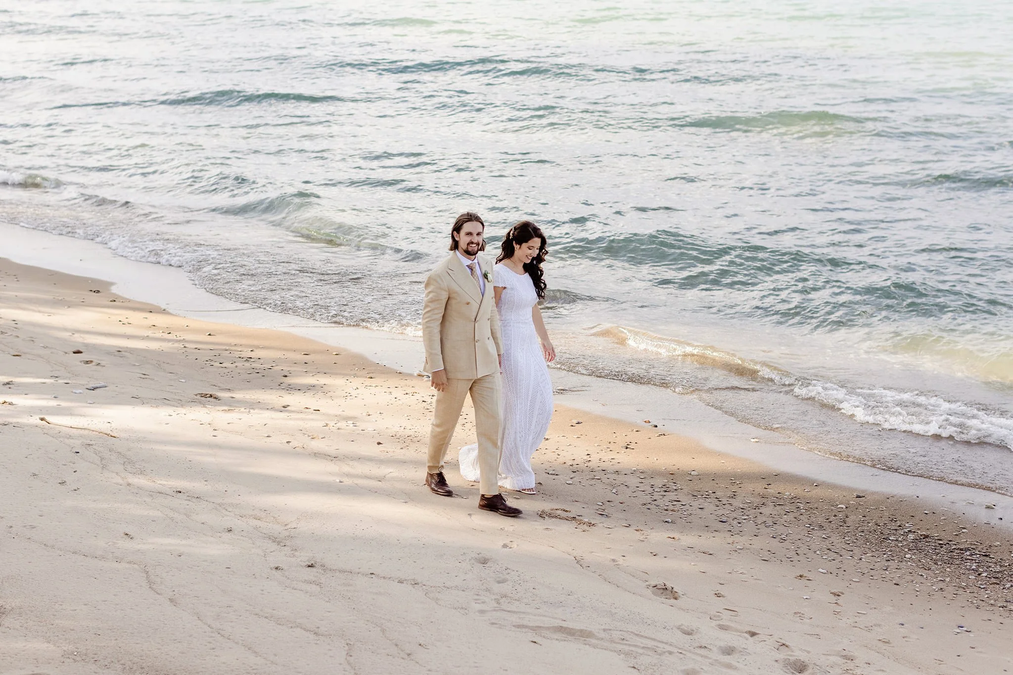 Bride and groom walk along the beach in a candid wedding photo. View fullsize